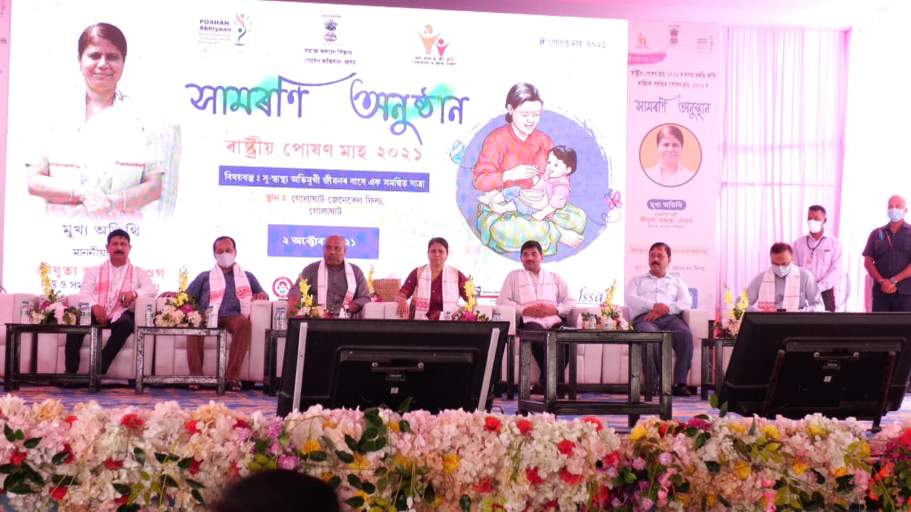 গোলাঘাট, ২ অক্টোবৰঃ ৰাষ্ট্ৰীয় পোষণ মাহ-২০২১ৰ সৈতে সংগতি ৰাখি অসমতো যোৱা পহিলা ছেপ্টেম্বৰৰ পৰা আৰম্ভ হোৱা পোষণ মাহৰ সামৰণি অনুষ্ঠান আজি গোলাঘাট নগৰৰ জেনেৰেল ফিল্ডত ৰাজ্যিক পৰ্যায়ত সম্পন্ন হয় । অনুষ্ঠানত মুখ্যমন্ত্ৰী ডঃ হিমন্ত বিশ্ব শৰ্মাই এটা ভিডিঅ’ বাৰ্তাত কয় যে পুষ্টিহীনতা দূৰ কৰা আৰু পৰিপুষ্টি সন্দৰ্ভত সজাগতা সৃষ্টিৰ ক্ষেত্ৰত পোষণ অভিযান এক বহুমাত্ৰিক কৰ্মযজ্ঞ । এই অভিযানক আমি জনসজাগতাৰ এটা মাধ্যম হিচাপে গ্ৰহণ কৰিব বিচাৰিছো বুলি তেওঁ উল্লেখ কৰে । তেওঁ কয় যে ই এটা জন অংশীদাৰী অভিযানত পৰিণত হ’ব লাগিব । সন্মিলিত প্ৰচেষ্টাৰে অপুষ্টিৰ বিৰুদ্ধে যুদ্ধ ঘোষণা কৰাৰ লগতে প্ৰধানমন্ত্ৰী নৰেন্দ্ৰ মোদীৰ পুষ্টিহীনতামুক্ত ভাৰত গঢ় দিয়াত সকলোকে ঐক্যবদ্ধভাৱে প্ৰয়াস চলাবলৈ তেওঁ আহ্বান জনায় ।