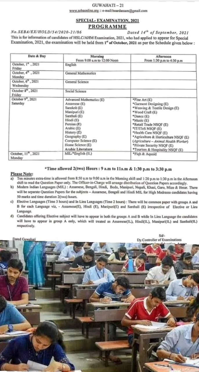 ডিজিটেল ডেস্ক,১৫ চেপ্টেম্বৰঃৰাজ্যৰ হাইস্কুল শিক্ষান্ত পৰীক্ষা আৰু হাই মাদ্ৰাছা পৰীক্ষাৰ ফলাফলক লৈ অসন্তুষ্ট ছাত্ৰ-ছাত্ৰী সকলৰ বাবে বিশেষ পৰীক্ষা অনুষ্ঠিত কৰিব SEBAই।অহা ১ অক্টোবৰৰ পৰা অনুস্থিত হব এই বিশেষ পৰীক্ষা৷১১ অক্টোবৰত সমাপ্ত হব এই পৰীক্ষা৷ইতিপূৰ্বেই ঘোষিত ফলাফলক লৈ অসন্তুষ্ট শিক্ষাৰ্থীসকলে আবেদন কৰিছে৷পৰিক্ষাৰ্থীয়ে নিজ নিজ কেন্দ্ৰৰ পৰা পৰীক্ষাৰ প্ৰৱেশ পত্ৰ সংগ্ৰহ কৰিব পাৰিব৷