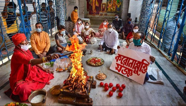 পশ্চিমবংগৰ স্থানীয় সংবাদ পত্ৰ আনন্দ বাজাৰ পত্ৰিকা আৰু এই সময়ত প্ৰকাশিত বাতৰি মতে নৱগ্ৰহ যজ্ঞৰ লগতে কাপোৰেৰে কৰ’না ভাইৰাছৰ প্ৰতিকৃতি তৈয়াৰ কৰি সেয়া যজ্ঞৰ অগ্নিত দাহো কৰিছে একাংশ অত্যুৎসাহীয়ে। যজ্ঞত লকডাউন অমান্য কৰি যথেষ্ট লোকে ভিৰ কৰিছিল বুলিও বাতৰিটোত কোৱা হৈছে।