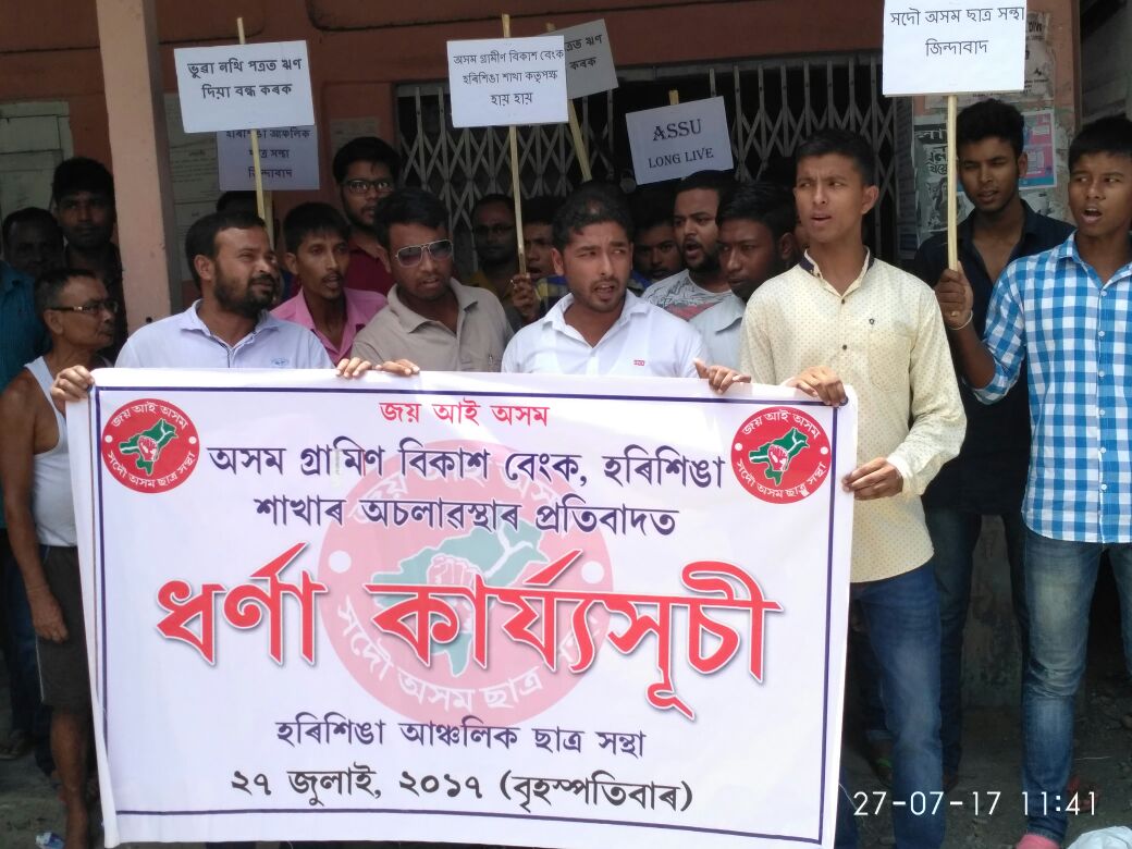 হৰিশিঙাঃ অসম গ্ৰামীণ বিকাশ বেংকৰ হৰিশিঙা শাখা পুনৰাই সক্ৰিয় কৰাৰ দাবীত আজি স্থানীয় ছাত্ৰ সন্থাই প্ৰতিবাদ সাব্যস্ত কৰে৷ দীৰ্ঘ দিন ধৰি বেংকটোৰ কাম-কাজ বন্ধ হৈ থকাত বেংক কৰ্তৃপক্ষৰ সৈতে ৰাইজে বহুবাৰ আলোচনাত বহিছিল যদিও বেংক কৰ্তৃপক্ষই বেংকৰ শাখাটো সক্ৰিয় কৰাত গুৰুত্ব আৰোপ নকৰাত আজি হৰিশিঙা আঞ্চলিক ছাত্ৰ সন্থাই বেংকৰ শাখাটোৰ সন্মুখত ধৰ্না কাযসূচী ৰূপায়ন কৰে৷