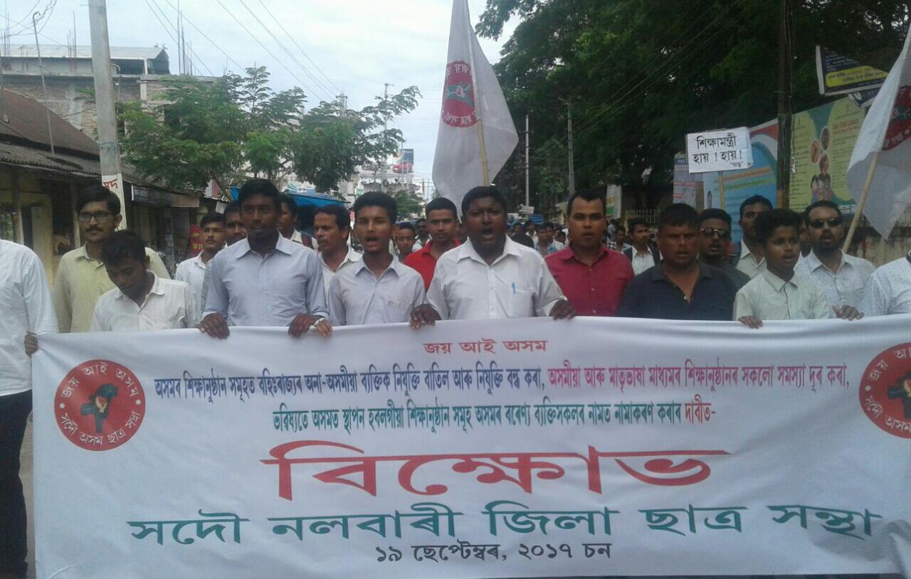 অগপ, বিজেপি, বিপিএফ মিত্ৰ জোঁট চৰকাৰৰ বিৰুদ্ধে ৰাজ্যৰ দল-সংগঠনে প্ৰতিবাদ অব্যাহত ৰখাৰ সময়তে ৰাজ্যৰ অন্যতম জাতীয়তাবাদী সংগঠন সদৌ অসম ছাত্ৰ সন্থাই বিগত কেবাদিন ধৰি প্ৰতিবাদ সাব্যস্ত কৰি আহিছে বিজেপি নেতৃত্বাধীন ৰাজ্য-কেন্দ্ৰীয় চৰকাৰৰ বিৰুদ্ধে৷ মৌলিক সমস্যা সমাধানত ব্যৰ্থ চৰকাৰ খনে মাতৃ ভাষাৰ বিদ্যালয়সমূহ ধ্বংস কৰাৰ কৰাৰ ষড়যন্ত্ৰত লিপ্ত হোৱা বুলি অভিযোগ উত্থাপন কৰে সংগঠনটোৱে৷