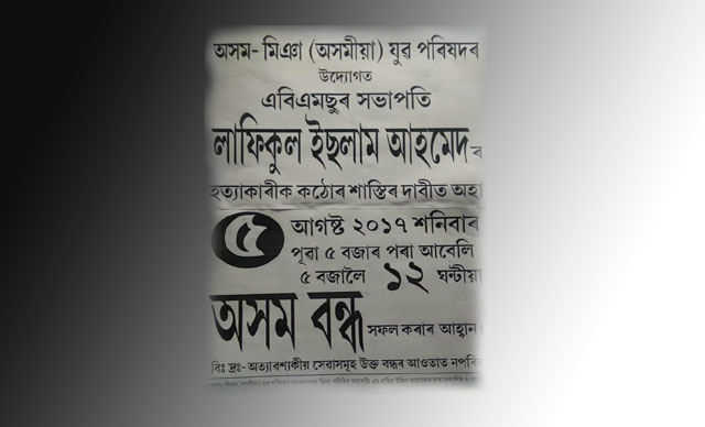কোকৰাঝাৰঃ কোকৰাঝাৰ চহৰৰ তিতাগুৰিত দিন-দুপৰতে এবিএমছুৰ সভাপতি লাফিকুল ইছলাম আহমেদক আততায়ীয়ে শূন্য দূৰত্বৰ পৰা গুলীয়াই হত্যা কৰা ঘটনাই ৰাজ্যৰ সৰ্বত্ৰে তীব্ৰ প্ৰতিবাদ অব্যাহত থকাৰ সময়ছোৱাতে লাফিকুলৰ হত্যাকাৰীক কঠোৰ শাস্তিৰ দাবী তুলি অসম মিঞা পৰিষদে কাইলৈ অৰ্থাৎ ৫ আগষ্টত ১২ ঘন্টীয়া অসম বন্ধৰ আহ্বানৰ তীব্ৰ বিৰোধিতা কৰিছে এবিএমছুৱে৷