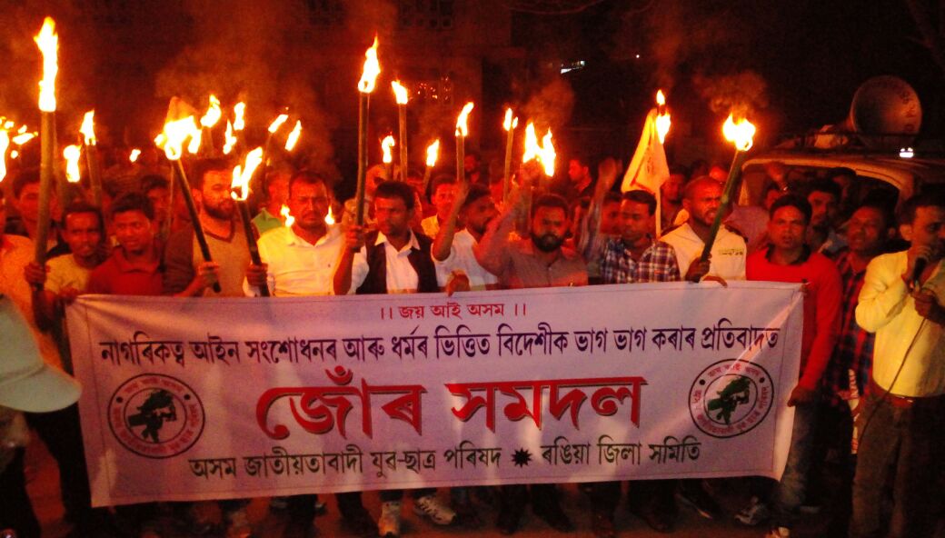 কেন্দ্ৰৰ বিজেপি চৰকাৰে অসমত জাপি দিব খোজা অবৈধ নাগৰিকক অসমৰ ৰাইজে কেতিয়াও অসমত সংস্থাপন দিয়াৰ পক্ষপাতী নহয় সেই কথাকেই যুৱ-ছাত্ৰ পৰিষদৰ জোঁৰ সমদল কাৰ্যসূচীয়ে প্ৰতিপন্ন কৰে৷ অসমৰ খিলঞ্জীয়া লোকৰ সংশয় তথা ভাবুকি আহিব পৰা কোনো কাম যুৱ-ছাত্ৰ পৰিষদে চৰকাৰক কৰিবলৈ নিদিয়াৰ হুংকাৰ প্ৰদান কৰে যুৱ-ছাত্ৰ পৰিষদে আজিৰ কাৰ্যসূচীৰ জৰিয়তে৷ ৰাজ্যৰ মঙলদৈ, দৰং, নলবাৰী, তিনিচুকীয়া, যোৰহাট, শিৱসাগৰ আদি ঠাইৰ লগতে ৰঙিয়াতো এই কাৰ্যসূচী ৰূপায়ণ কৰা হয়৷ ধৰ্মৰ ভিত্তিত বিদেশীক ভাগ ভাগ কৰাৰ প্ৰতিবাদত ৰঙিয়াত সংগঠনটোৱে শুকুৰবাৰে সন্ধিয়া জোঁৰ সমদল উলিয়ায়।