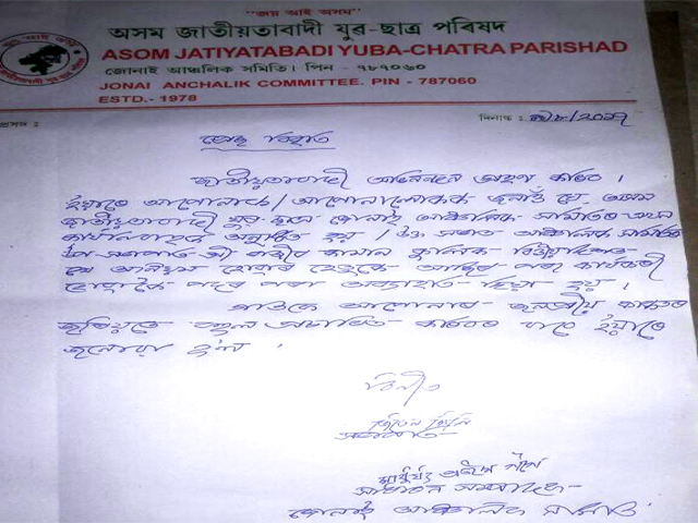 জোনাইঃ অসম জাতীয়তাবাদী যুৱ-ছাত্ৰ পৰিষদৰ জোনাই আঞ্চলিক সমিতিয়ে সংগঠনটোৰ পৰা এগৰাকী নেতাক অব্যাহতি দিয়ে৷ আজি সংগঠনটোৱে অনুষ্ঠিত কৰা এখন জৰুৰী কাৰ্যনিবাহক সভা অনুষ্ঠিত কৰি কেইবাটাও গুৰুত্বপূৰ্ণ প্ৰস্তাৱ গ্ৰহণ কৰে।