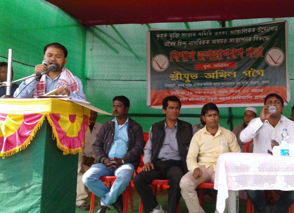 আজি নীলবাগানত কৃষক মুক্তিৰ যমুনামুখ সমষ্টি কমিটিৰ উদ্যোগত বিজেপি চৰকাৰৰ উচ্ছেদ নীতি,সাম্প্ৰদায়িকতা তথা হিন্দু বাংলাদেশীক অসমত সংস্থাপন দিয়াৰ বিৰুদ্ধে অনুষ্টিত ৰাইজমেলখনত উপস্থিত থাকি ভাষন প্ৰসংগত এই মন্তব্য কৰি অখিল গগৈয়ে কয় যে হিন্দু বাংলাদেশী নাগৰিকক অসমত সংস্থাপন কৰি অসমখনক এখন হিন্দু ৰাষ্ট্ৰ কৰিব বিচাৰিছে বিজেপি চৰকাৰখনে৷ এই নাগৰিকত্ব বিধেয়কখনক তেওঁ বাংলাদেশীৰ নিমন্ত্ৰণী পত্ৰ বুলি উল্লেখ কৰে৷