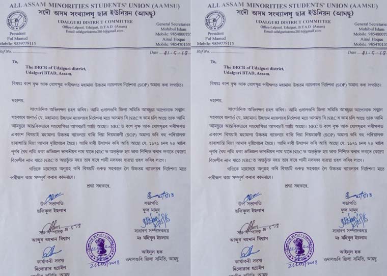 সংগঠনটোৰ ওদালগুৰি জিলা সমিতিয়ে এক বিবৃতি যোগে ন্যায়ালয়ৰ নিৰ্দেশনা মতে ৰাজ্যত চলি থকা এনআৰচি উন্নীতকৰণক আমছুৱে আদৰণি জনাই কিন্তু বংশবৃক্ষ আৰু যোগসূত্ৰ পৰীক্ষণৰ ক্ষেত্ৰত একাংশ বিষয়া-কৰ্মচাৰীয়ে ৰাইজক হাৰাশাস্তি কৰাৰ অভিযোগ উত্থাপন কৰে। বহু দূৰৰ পৰা পৰীক্ষণৰ বাবে যোৱা লোকসকলক উপযুক্ত নথিপত্ৰ থকাৰ পাছতো কৰ্মচাৰীসকলে পোনে পোনে কাম সমাধা নকৰি হাৰাশাস্তি প্ৰদান কৰা বুলি সংগঠনটোৱে অভিযোগ উত্থাপন কৰে। হাৰাশাস্তি প্ৰদান কৰা লোকসকল অশিক্ষিত লোক বুলি কয়৷