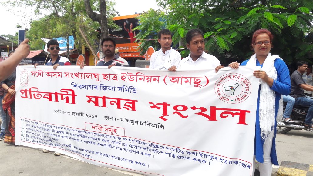 গুৱাহাটীঃ গোৱালপাৰাত আৰক্ষীৰ গুলীত নিহত ইয়াকুব আলীৰ মৃত্যুৰ বাবে দায়ী আৰক্ষী বিষয়া ডিম্বেশ্বৰ ৰয় আৰু আৰক্ষী কনিষ্টবল অনুপ চেতিয়াক গ্ৰেপ্তাৰ নকৰাৰ অভিযোগ উত্থাপন কৰাৰ লগতে নিহতৰ নিকটাত্মীয়ক ১০ লাখ আৰু আহত সকলক ৫ লাখকৈ ক্ষতিপূৰণ দিয়াৰ দাবীত আজি আমছুৱে ৰাজ্যজুৰি মানৱ শৃংখল কাৰ্যসুচী ৰূপায়ণ কৰে৷