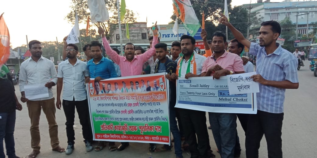 বিলাসীপাৰাঃ সমগ্ৰ দেশৰ লগতে নামনি অসমৰ ধুবুৰী জিলাৰ ২৬ নং বিলাসীপাৰা পশ্চিম সমষ্টিৰ যুৱ কংগ্ৰেছৰ উদ্যোগত আজি বিয়লি ৪ বজাত বিলাসীপাৰাৰ গান্ধী চ’কত কেন্দ্ৰীয় চৰকাৰৰ বিত্তীয় মন্ত্ৰী অৰুণ জেটলিৰ প্ৰতি মূৰ্তি দাহ কৰে। উল্লেখযোগ্য যে দেশৰ জনসাধাৰণৰ কষ্টৰ ধন আত্মসাৎ কৰি মেহুল চোকসী বিদেশলৈ পলাযই যায আৰু বিদেশৰ পৰা অৰুণ জেটলিৰ জীয়েক সোনালী জেটলিৰ একাউন্টত ২৪ লাখ টকা পঠাই দিয়ে। ইয়াৰ বিৰুদ্ধে কোনো ধৰণৰ ব্যৱস্থা গ্ৰহণ নকৰাত কেন্দ্ৰীয় চৰকাৰৰ বিত্তীয় মন্ত্ৰী অৰুণ জেটলিৰ বিৰুদ্ধে বিলাসীপাৰা পশ্চিম সমষ্টিৰ যুৱ কংগ্ৰেছৰ সভাপতি ছাফিজুৰ ৰহমানৰ নেতৃত্বত অৰ্ধ শতাধিক যুৱ কৰ্মীয়ে বিজেপি চৰকাৰ গ বেক গ বেক ৰাহুল গান্ধী জিন্দাবাদ আদি শ্ল গানেৰে বিলাসীপাৰা চহৰ উত্তাল কৰি প্ৰতিবাদ সাব্যস্ত কৰাৰ লগতে মন্ত্ৰী গৰাকীৰ প্ৰতি মূৰ্তি দাহ কৰে।