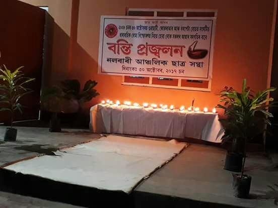 নলবাৰী আঞ্চলিক ছাত্ৰ সন্থাৰ সাধাৰণ সম্পাদক নিলকমল বৰ্মনে আতঁ ধৰা অনুষ্ঠানত আছুৰ ৰাজ্যিক সাংগঠনিক সম্পাদক হিমান বৰ্মন, সাধাৰণ সম্পাদক অক্ষয় ডেকা, ছাত্ৰ নেতা ভবজিত বেজবৰুৱা, শশাংক দত্ত, ৰিয়াজউদ্দিন আহমেদ, আঞ্চলিক সমিতিৰ সভাপতি ৰুবুল বৰ্মন, জিলা কৰ্মচাৰী পৰিষদৰ সাধাৰণ সম্পাদক উদয় বৰ্মন সহ বহু সংখ্যক বিশিষ্ট লোকে বন্তি প্ৰজ্বলন কৰি শ্ৰদ্ধা নিবেদন কৰে৷