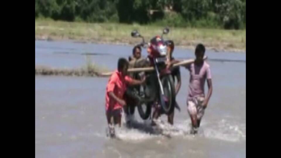 মুছলপুৰঃ জেঠৰ বৰষুণত পাগলাদিয়াত পানীৰ ঢল অহাৰ লগে লগে দেখা গৈছে এক বিশেষ দৃশ্য৷ মানুহৰ কান্ধত বাইক। বৃহস্পতিবাৰৰ এই দৃশ্য বাক্সা জিলাৰ পাগলাদিয়া নদীৰ।
