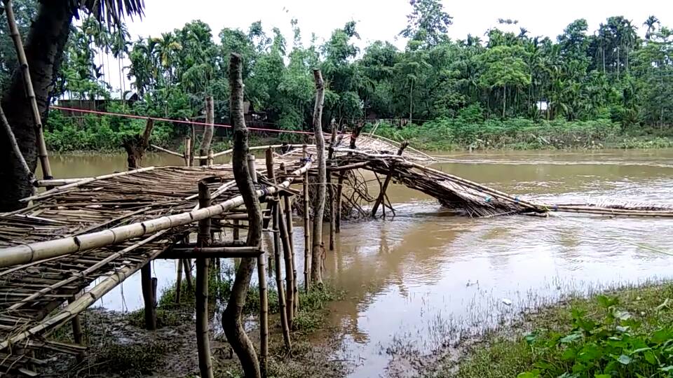 বহিঃ জগতৰ সৈতে যোগাযোগৰ একমাত্ৰ সম্বল ৰাইজে গাঁঠিৰ ধনেৰে নিৰ্মিত বাহৰ দলংখন বানপানীত উটি যোৱাত মূৰে-কপালে হাত দিছে ৰাইজে৷ ৰহা বিধান সভা সমষ্টিৰ শিঙিমাৰী ঘাটত বৰপানী নদীৰ পানীয়ে উটুৱাই নিয়ে বাঁহৰ দলংখন।