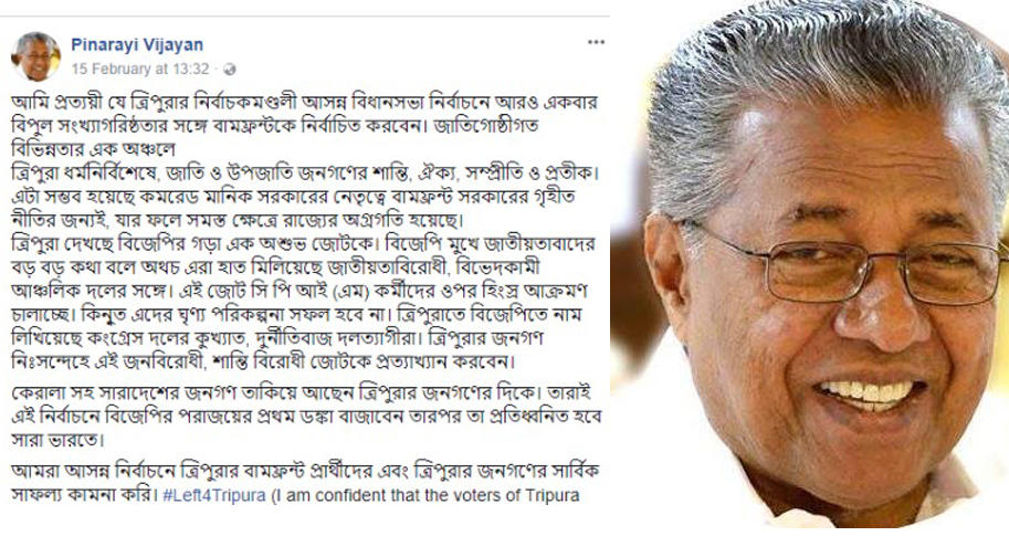 ত্ৰিপুৰাবাসীক ফেচবুক যোগে তেওঁ কয় ‘‘জনগোষ্ঠীগত বিভিন্নতাৰ এটি অঞ্চল ত্ৰিপুৰা৷ জাতি-উপজাতি জনগণৰ শান্তি ঐক্য, সম্প্ৰীতিৰ প্ৰতীক৷ সেয়া কেৱল মাণিক সৰকাৰৰ নেতৃত্বৰ বাম ফ্ৰন্টৰ চৰকাৰৰ বাবেহে সম্ভৱ হৈছে৷ যাৰ বাবে সমস্ত ক্ষেত্ৰত ৰাজ্যৰ উন্নয়ন হৈছে৷ ফেচবুক আপডেটত কেৰালাৰ মুখ্যমন্ত্ৰীয়ে আৰু কয় ‘‘বিজেপিয়ে মুখতহে জাতীয়তাবাদী বৰ বৰ কথা কয়৷