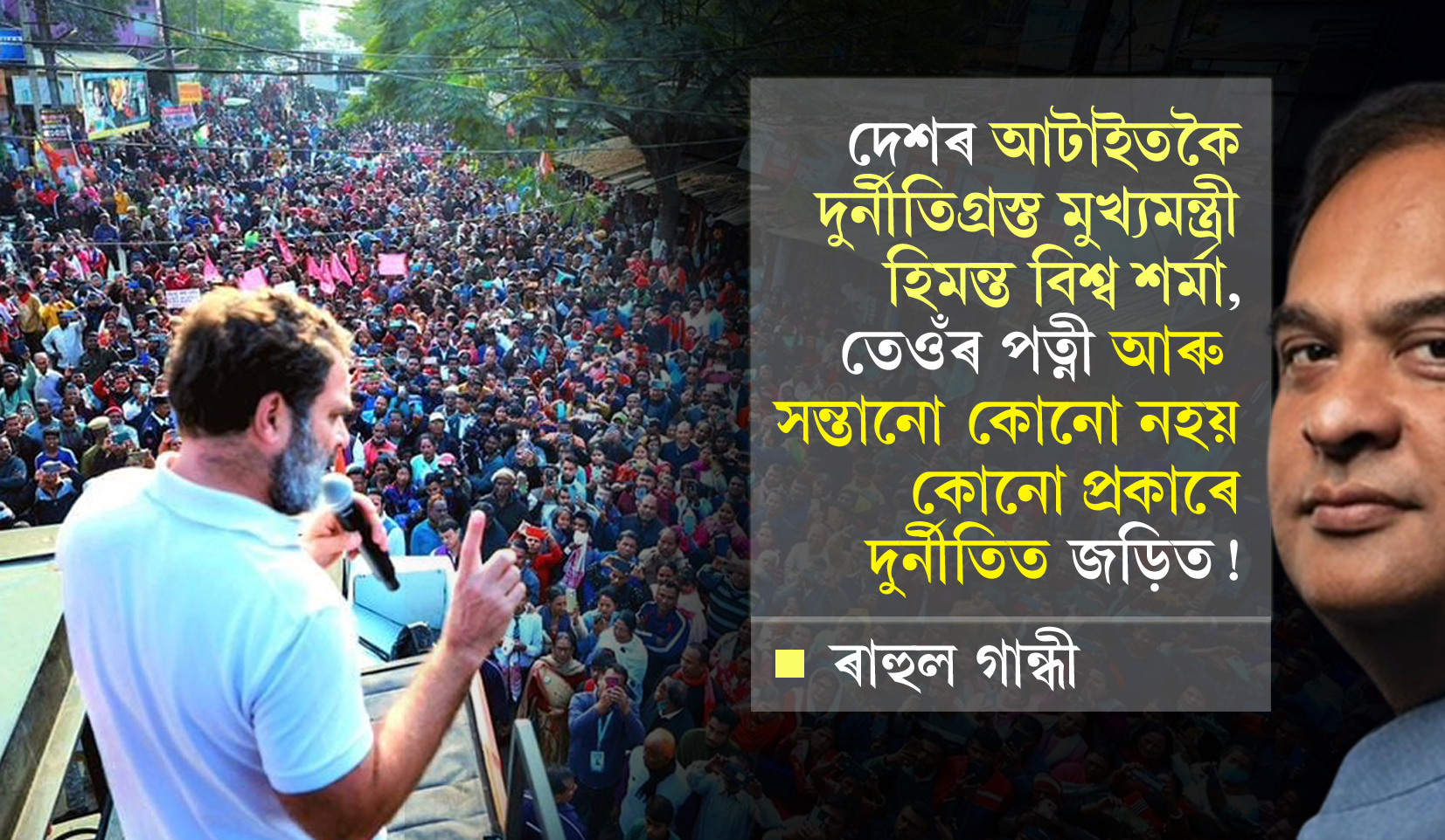 ভাৰতৰ আটাইতকৈ দুৰ্নীতিগ্ৰস্ত, ভ্ৰষ্ট মুখ্যমন্ত্ৰীজনেই হৈছে অসমৰ মুখ্যমন্ত্ৰীজন। তেওঁৰ পৰিয়ালৰ প্ৰতিজন সদস্য, লাগিলে সেয়া তেওঁৰ সন্তানেই হওক বা তেওঁৰ পত্নীয়ে হওক, সকলোৱে একেলগে দুৰ্নীতি সংঘটিত কৰি আছে। ভাৰত জোড়ো ন্যায় যাত্ৰাৰ আজি পঞ্চম দিনা যোৰহাটত মুখ্যমন্ত্ৰী ড০ হিমন্ত বিশ্ব শৰ্মাৰ বিৰুদ্ধে এইদৰে সৰৱ হৈ পৰে কংগ্ৰেছ নেতা ৰাহুল গান্ধী।