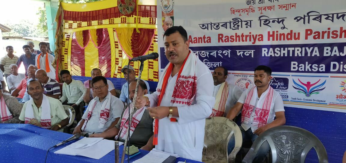 বাগসা জিলাৰ তামুলপুৰ মহকুমা সদৰৰ দুৰ্গা মন্দিৰ প্ৰাঙ্গণত দেওবাৰে আন্তঃৰাষ্ট্ৰীয় হিন্দু পৰিষদৰ বাগসা জিলা সমিতি গঠনৰ উদ্দেশ্যে অনুষ্ঠিত এখন ৰাজহুৱা সভাৰ উদ্দেশ্য বাখ্যা কৰি দীনেশ কলিতাই এইদৰে কয়।