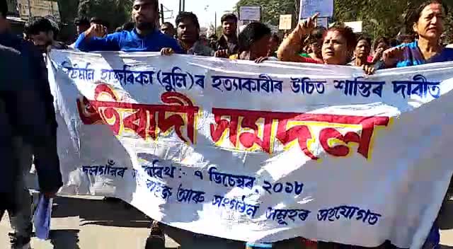 দৰংঃ দৰঙৰ মংগলদৈৰ বোৱাৰী বিতুমনি হাজৰিকাক যোৱা তিনি ডিচেম্বৰত অতি নিৰ্মমভাৱে জ্বলাই হত্যা কৰাৰ প্ৰতিবাদত আজি দৰঙৰ দলগাঁৱৰ ৰাজপথত এক বৃহৎ সমদল উলিয়াই তীব্ৰ প্ৰতিবাদ সাব্যস্ত কৰে বিভিন্ন দল সংগঠনৰ লগতে ৰাইজে৷ দলগাঁৱৰ জীয়ৰী বিতুমনি হাজৰিকাক মংগলদৈৰ নাহৰবাৰীত থকা স্বামীগৃহৰ পৰিয়ালে বিতুমনিক জ্বলাই হত্যা কৰা অভিযোগ তুলি আজিৰ প্ৰতিবাদত কেইবা শতাধিক পুৰুষ মহিলাই দলগাঁৱৰ ১৫ নং ৰাষ্ট্ৰীয় ঘাইপথত প্ৰতিবাদী সমদল উলিয়াই বোৱাৰী বিতুমনি হাজৰিকাক হত্যা কৰা স্বামী কিৰিতি বৰুৱাক অতিশীঘ্ৰে গ্ৰেপ্তাৰৰ দাবী তোলে৷
