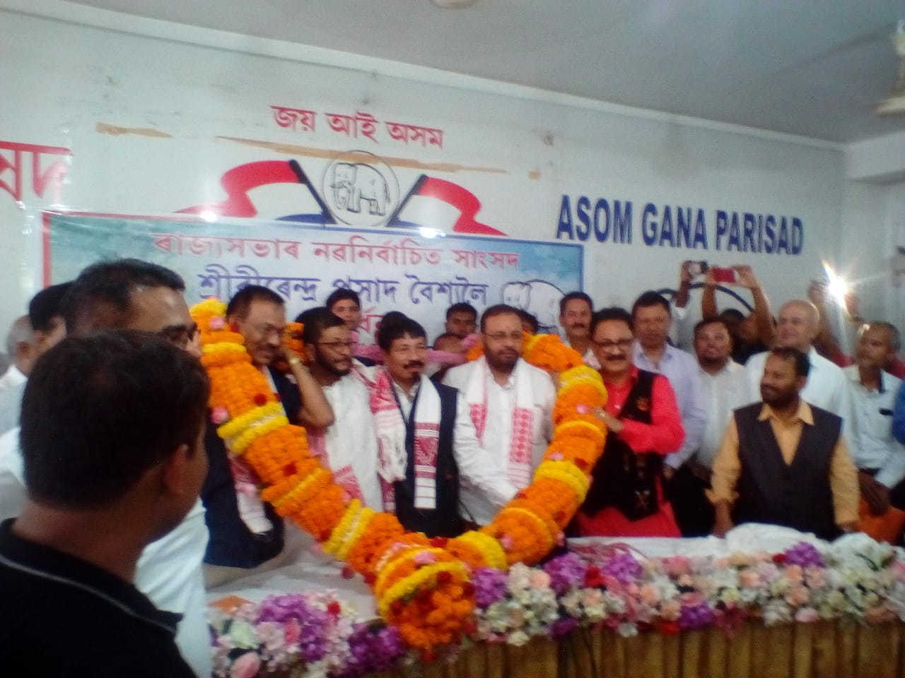গুৱাহাটীঃ দেশৰ সপ্তদশ লোকসভাৰ নিৰ্বাচনত বিজেপিৰে-অগপ জেন্টলমেন চুক্তিৰ অনুসৰি ৰাজ্যসভাৰ দ্বিতীয়খন আসন লাভ কৰাৰ পাছত বিনা প্ৰতিদ্বন্দিতাৰে অগপৰ প্ৰাৰ্থী বীৰেন্দ্ৰ প্ৰসাদ বৈশ্য ৰাজ্যসভালৈ নিৰ্বাচিত হোৱাৰ পাছত শনিবাৰে আমবাৰীৰ দলৰ মুখ্যকাৰ্যলয়ত দলীয় সম্বৰ্ধনা জনোৱা হয়।