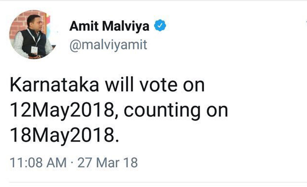ডিজিটেল ডেস্কঃ নিৰ্বাচন আয়োগৰ পূৰ্বেই কৰ্ণাটকৰ নিৰ্বাচনৰ ভোটগ্ৰহণ আৰু ভোটগণনাৰ দিন বিজেপিৰ আইটি চেলৰ প্ৰধানে ছচিয়েল মিডিয়াত প্ৰচাৰ কৰাৰ ঘটনাই তীব্ৰ চাঞ্চল্যৰ সৃষ্টি কৰিছে৷ বিজেপিৰ আইটি কোষৰ প্ৰধান অমিত মালব্যই টুইট কৰি নিৰ্বাচনৰ দিন প্ৰচাৰ কৰে মঙলবাৰে৷