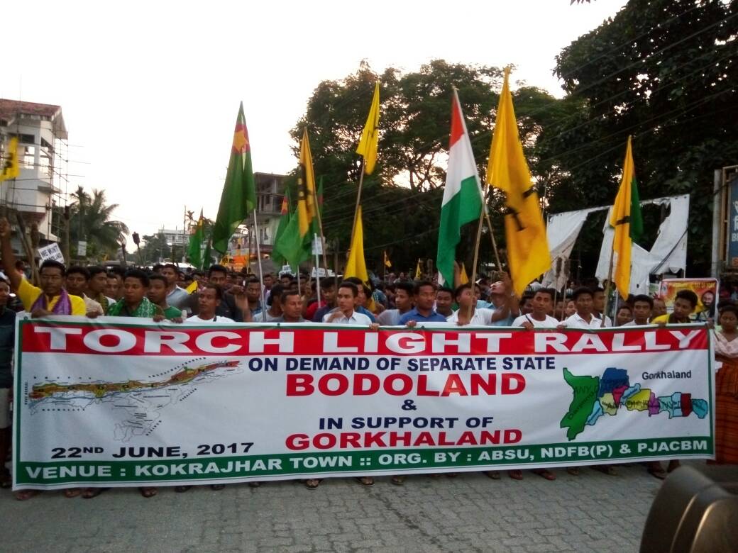 ৰাজ্যৰ  বিভিন্ন প্ৰান্তৰ লগতে আজি কোকৰাঝাৰতো নিখিল বড়ো ছাত্ৰ সন্থা চমুকৈ এবছু , এনডিএফবি (প্ৰ) , জইণ্ট একচন কমিটি ফৰ বড়োলেণ্ড মুভমেণ্ট আৰু সদৌ অসম গোৰ্খা ছাত্ৰ সন্থা চমুকৈ আগছুৱে যৌথভাৱে পৃথক বড়োলেণ্ড ৰাজ্য গঠনৰ দাবীত আৰু গোৰ্খালেণ্ড দাবীৰ সমৰ্থনত জোৰ লৈ সমদল উলিয়ায়৷ আজি সন্ধিয়া ৬ বজাত কোকৰাঝাৰস্থিত বডোফা শিশু উদ্যানৰ পৰা উল্লেখিত সংগঠন কেইটাৰ সহস্ৰাধিক নেতা, কৰ্মী- সদস্যই হাতে হাতে জোৰ লৈ সমদল উলিয়ায়৷