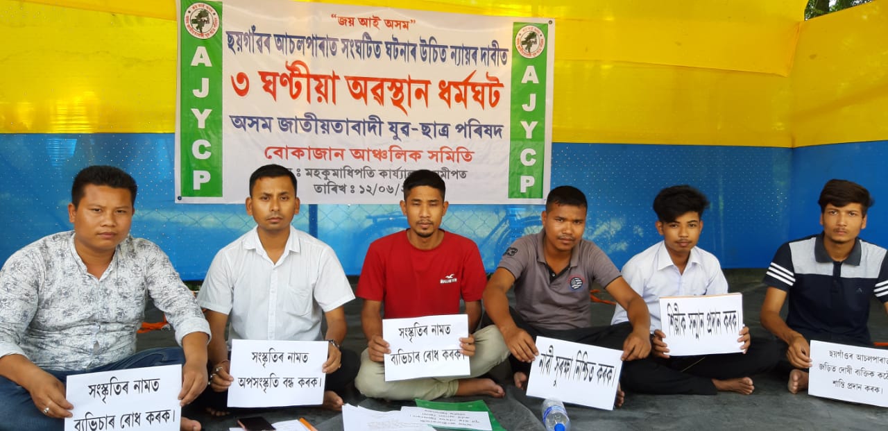 কাৰ্বি আংলংঃ অসম জাতীয়তাবাদী যুৱ-ছাত্ৰ পৰিষদ কাৰ্বি আংলং জিলা সমিতিৰ উদ্যোগত আৰু বোকাজান আঞ্চলিক সমিতিৰ সহযোগত বুধবাৰে বোকাজান মহকুমাধিপতি কাৰ্যালয়ৰ সন্মুখত ছয়গাঁৱৰ আচলপাৰাৰ ঘটনাৰ উচিত ন্যায়ৰ দাবীত ৩ ঘণ্টীয়া অৱস্থান ধৰ্মঘট কাৰ্যসূচী ৰূপায়ন কৰা হয়৷ অসমীয়া শিল্পী দলক উলংগ হৈ নাচিবলৈ কোৱা তথা শিল্পীৰ দলটোক কৰা এনে অশালীন মন্তব্য আৰু ব্যৱহাৰৰ প্ৰতিবাদত এই কাৰ্যসূচী ৰূপায়ন কৰা হয়৷