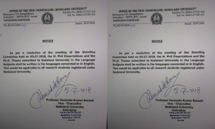বৃহস্পতিবাৰে অনুষ্ঠিত হোৱা বড়োলেণ্ড বিশ্ববিদ্যালয়ৰ ষ্টেণ্ডিং সমিতিৰ বৈঠকত বড়োলেণ্ড বিশ্ববিদ্যালয়ৰ অধীনত পঞ্জীয়ন কৰা গৱেষক ছাত্ৰ-ছাত্ৰীয়ে এতিয়াৰে পৰা ভাষা বিষয়ত সংশ্লিষ্ট ভাষাতে অথবা ইংৰাজীত নিজৰ গৱেষণাপত্ৰ লিখিব পাৰিব বুলি সিদ্ধান্ত গ্ৰহণ কৰিছে। বড়োলেণ্ড বিশ্ববিদ্যালয়ৰ ষ্টেণ্ডিং সমিতিৰ এই সিদ্ধান্ত সন্দৰ্ভত বড়োলেণ্ড বিশ্ববিদ্যালয়ৰ উপাচাৰ্য হেমন্ত কুমাৰ বৰুৱাই বিইউ/ভিচি/২০১৮/৬৫৯ নম্বৰৰ এক জাননী জাৰি কৰি এই কথা সকলো পক্ষকে অৱগত কৰিছে।