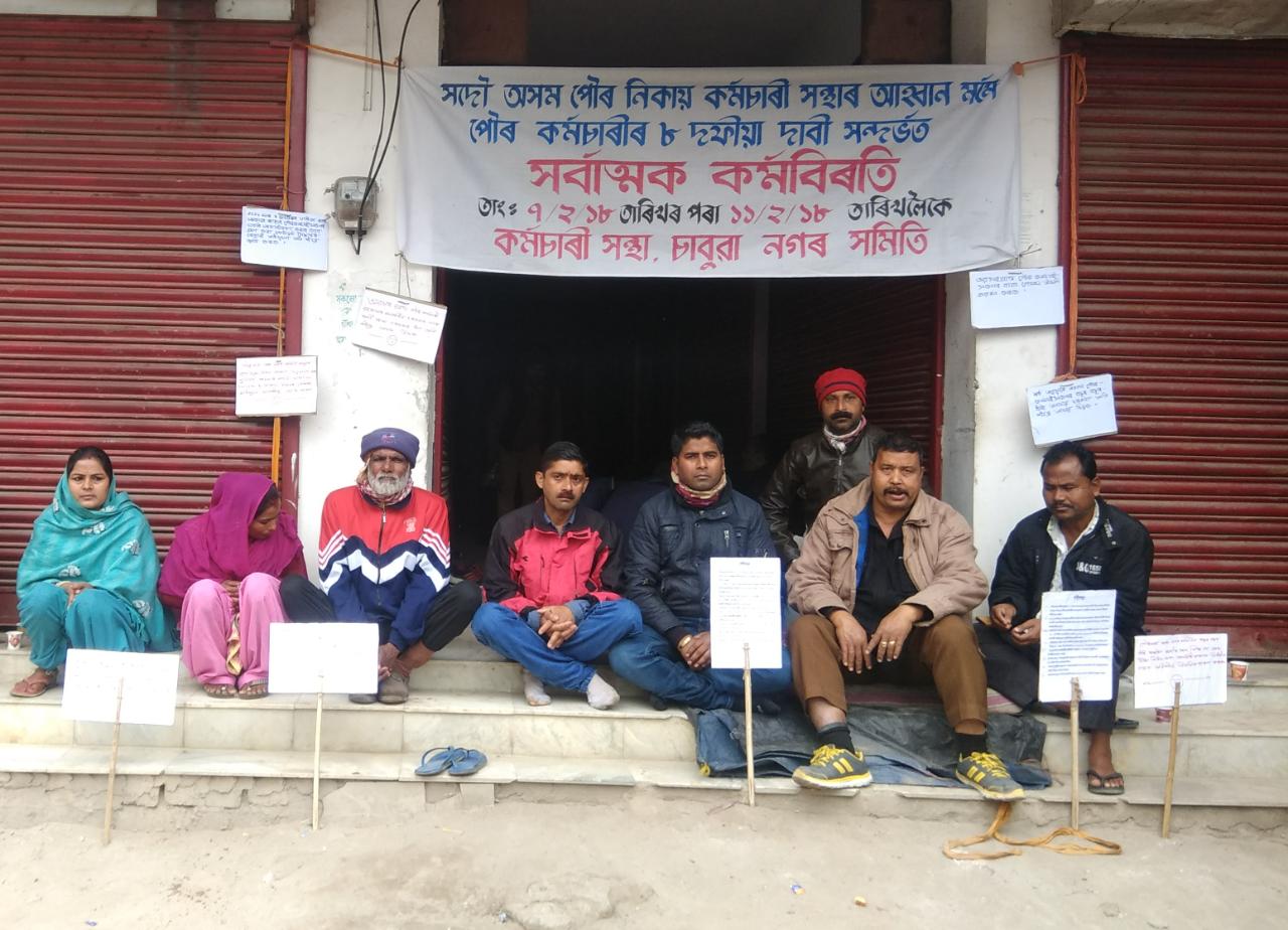 পৌৰ কৰ্মচাৰী সকলৰ চাকৰিৰ নিয়মীয়াকৰণ, দৰমহা নিয়মীয়াকৰণ আদি দাবী পূৰণৰ দাবীত সদৌ অসম পৌৰ-নিকায় কৰ্মচাৰী সন্থাৰ আহ্বান মৰ্মে প্ৰতিবাদ সাব্যস্ত কৰে৷ অৱস্থান ধৰ্মঘট আৰু সৰ্বাত্মক কৰ্মবিৰতি কাৰ্যসূচী পালন কৰাৰ ফলত ৰাজ পথত জাৱৰৰ দম পৰি ৰয়৷