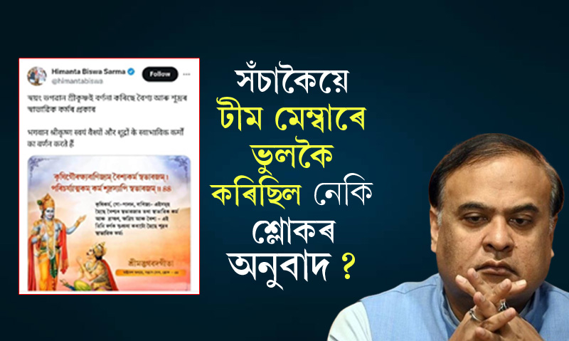 ছ’চিয়েল মিডিয়াযোগে ব্ৰাহ্মণ্যবাদক প্ৰাধান্য দিয়া পোষ্টৰ বাবে ‘ছ’ৰী’ বুলি কৈ অৱশেষত ৰাজহুৱাকৈ ক্ষমা বিচাৰিলে মুখ্যমন্ত্ৰী ড০ হিমন্ত বিশ্ব শৰ্মাই। বৃহস্পতিবাৰে নিশা এক টুইটযোগে ক্ষমা বিচাৰে মুখ্যমন্ত্ৰীগৰাকীয়ে। ক্ষমা বিচাৰি কৰা টুইটটোত মুখ্যমন্ত্ৰীগৰাকীয়ে তেওঁৰ ছ’চিয়েল মিডিয়া চোৱা-চিতাৰ দায়িত্বত থকা টীমৰ এজন সদস্যই গীতৰ শ্লোক ভুলকৈ অনুবাদ কৰি পোষ্ট কৰিছিল বুলি মন্তব্য কৰা দেখা গৈছে।