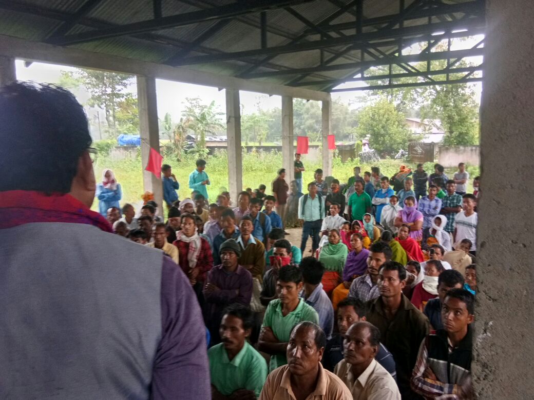 স্থানীয় সমাজকৰ্মী বিনন্দ মুছাহাৰীৰ সভাপতিত্বত অনুষ্ঠিত সভাত অতিথি হিচাপে অংশগ্ৰহন কৰে কৃষক মহাসভাৰ মূখ্য আহ্বায়ক বলীন্দ্ৰ শইকীয়া, চিপিআই এম-এলৰ ৰাজ্যিক সভাপতি বিবেক দাস, সম্পাদক ৰুবুল শৰ্মা, কৃষক মহাসভাৰ সদস্য লক্ষীকান্ত কূৰ্মী, বিপ্লৱী যুৱ-সন্থাৰ মুখ্য আহ্বায়ক পৰিমল গোঁড, ধনঞ্জয় দাস, বিকাশ চুব্বা অসম সংগ্ৰামী চাহ-শ্ৰমিক সংঘৰ বিশ্বনাথ চক্ৰ সমিতিৰ সভাপতি নৰোত্তম চুণ্ডী সম্পাদক কৃষ্ণ পাইকে।