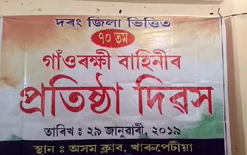 দৰংঃ দৰঙৰ আৰক্ষী প্ৰশাসনৰ উদ্যোগত খাৰুপেটীয়া আছাম ক্লাৱৰ প্ৰেক্ষাগৃহত মঙলবাৰে আয়োজিত ৭০ তম গাঁও ৰক্ষী বাহিনীৰ প্ৰতিষ্ঠা দিৱসত গাঁওৰক্ষী বাহিনীৰ সভাপতি সম্পাদক আৰু মহিলা গাঁওৰক্ষী বাহিনীৰ সভাপতি, সম্পাদকৰ লগতে পাঁচশতাধিক লোক উপস্থিত থাকে৷