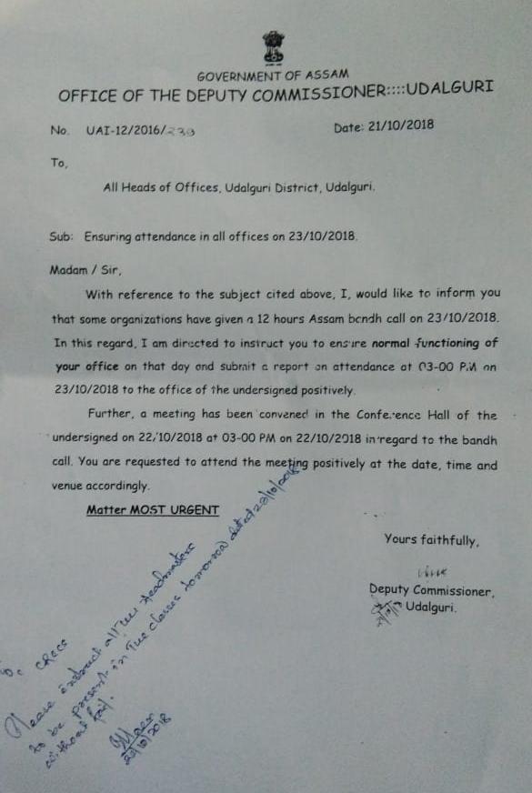 পত্ৰখনত উল্লেখ কৰি জিলা উপায়ুক্ত গৰাকীয়ে কয় যে ২৩ অক্টোবৰ মঙ্গলবাৰে কিছুসংখ্যক সংগঠনে ১২ ঘণ্টীয়া অসম বন্ধ ঘোষণা কৰিছে। উক্ত দিনটোত জিলাখনৰ সকলো কৰ্মচাৰীকে নিজৰ নিজৰ চৰকাৰী কাৰ্যালয়ত উপস্থিত থকাৰ লগতে উপস্থিতিৰ খতিয়ানসমূহ আবেলি ৩ বজাৰ ভিতৰত জিলা উপায়ুক্তৰ কাৰ্যালয়ত জমা দিবলৈ নিৰ্দেশ জাৰি কৰা হৈছে।