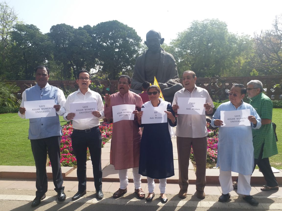 Rajya Sabha & Lok Sabha Mps from Assam today staged protest with Dharna in front of Mahatma Gandhi statue of parliament house protesting against the anti -women attitude of Assam BJP govt move to convert the only women university of Assam to an institute.@RahulGandhi @INCIndia pic.twitter.com/XGG0mzWmEG