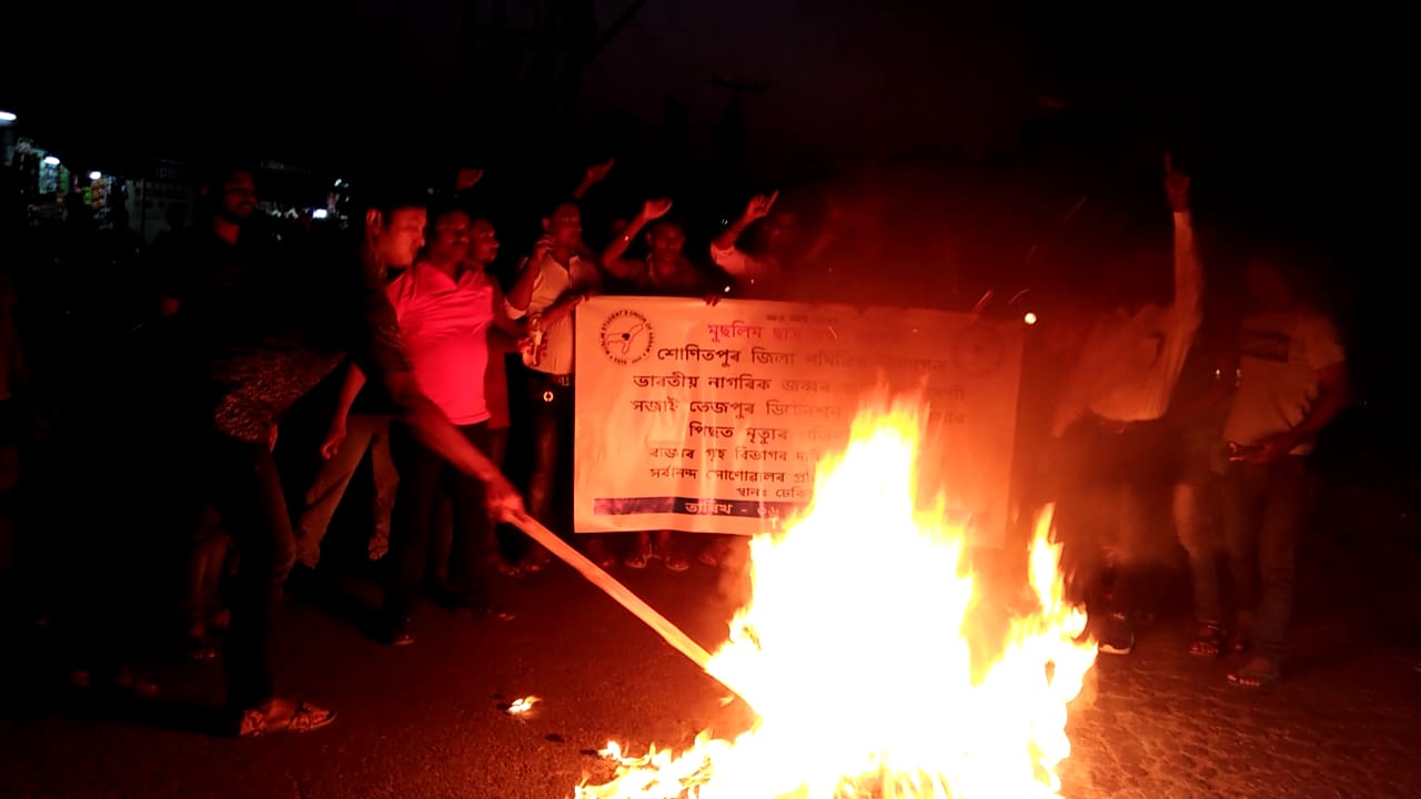 ডিটেনশ্বন কেম্পত মৃত্যু হোৱা জব্বৰ আলিৰ মৃত্যুৰ প্ৰতিবাদত ঢেকীয়াজুলিত মুখ্যমন্ত্ৰীৰ প্ৰতিমূৰ্তি দাহ