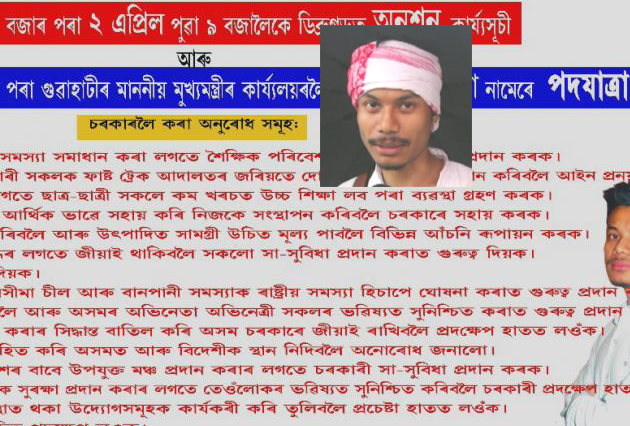 যুৱকজনে ৰাজ্যৰ মুখ্যমন্ত্ৰীৰ ৰাজধানী মহানগৰী গুৱাহাটীত উপস্থিত হৈ মুখ্যমন্ত্ৰীক লগ ধৰি ক’ব ১৫টা সমস্যাৰ কথা৷ ২ এপ্ৰিলৰ পৰা গুৱাহাটী অভিমুখে যাত্ৰা আৰম্ভ কৰিছিল দিবাকৰে৷ উজনিৰ পৰা পদব্ৰজে গুৱাহাটীলৈ আহি অসম চৰকাৰক কেইটামান দাবী জনাব৷ ২ এপ্ৰিলৰ দিনৰ ১২ বজাৰ পৰা ডিব্ৰুগড়ৰ পৰা গুৱাহাটী অভিমুখে পদব্ৰজে যাত্ৰা আৰম্ভ কৰা যুৱকজনে মুখ্যমন্ত্ৰী কাৰ্যালয়ত উপস্থিত হৈ তেওঁ কেইটামান দাবী উত্থাপন কৰিব৷