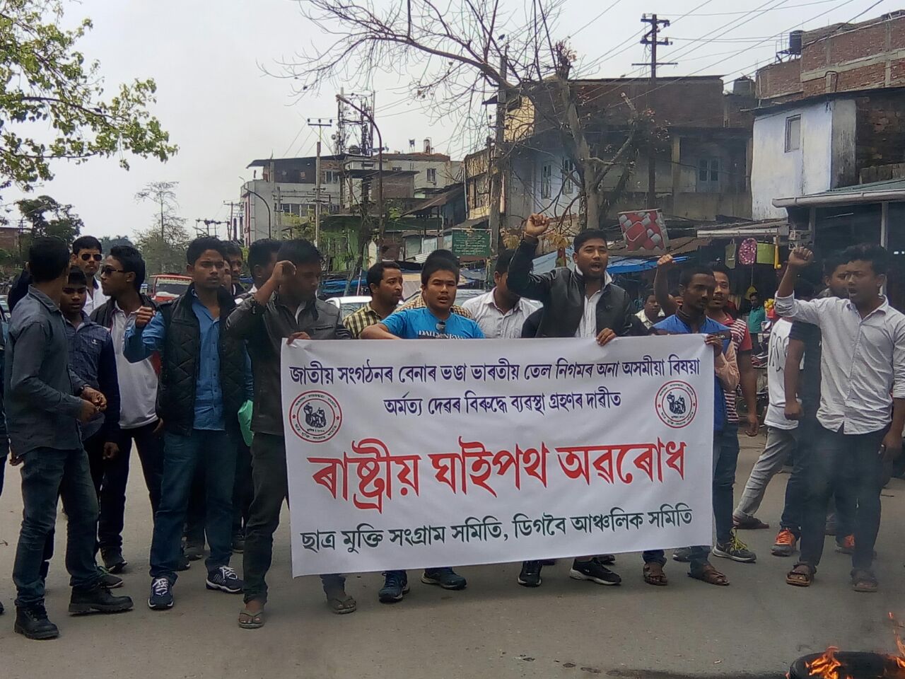 ডিগবৈঃ ডিগবৈত অইলৰ এগৰাকী বিষয়াৰ বিৰুদ্ধে তীব্ৰ প্ৰতিবাদ সাব্যস্ত কৰে ছাত্ৰ মুক্তি সংগ্ৰাম সমিতিয়ে৷ ছাত্ৰ মুক্তি সংগ্ৰাম সমিতিৰ বেনাৰ ফলাৰ অভিযোগ উত্থাপন কৰি অইলৰ বিষয়াৰ বিৰুদ্ধে ৰাষ্ট্ৰীয় ঘাইপথ অৱৰোধ কৰি ছাত্ৰ মুক্তি সংগ্ৰাম সমিতিয়ে প্ৰতিবাদ সাব্যস্ত কৰে৷ সংগঠনটোৱে ডিগবৈত এটা কাৰ্যালয় আৰু ডিগবৈ মহাবিদ্যালয়ৰ ছাত্ৰ-ছাত্ৰীৰ বাবে চাইকেল আস্থান নিৰ্মাণ কৰিছিল বুলি জানিব পৰা যায়।