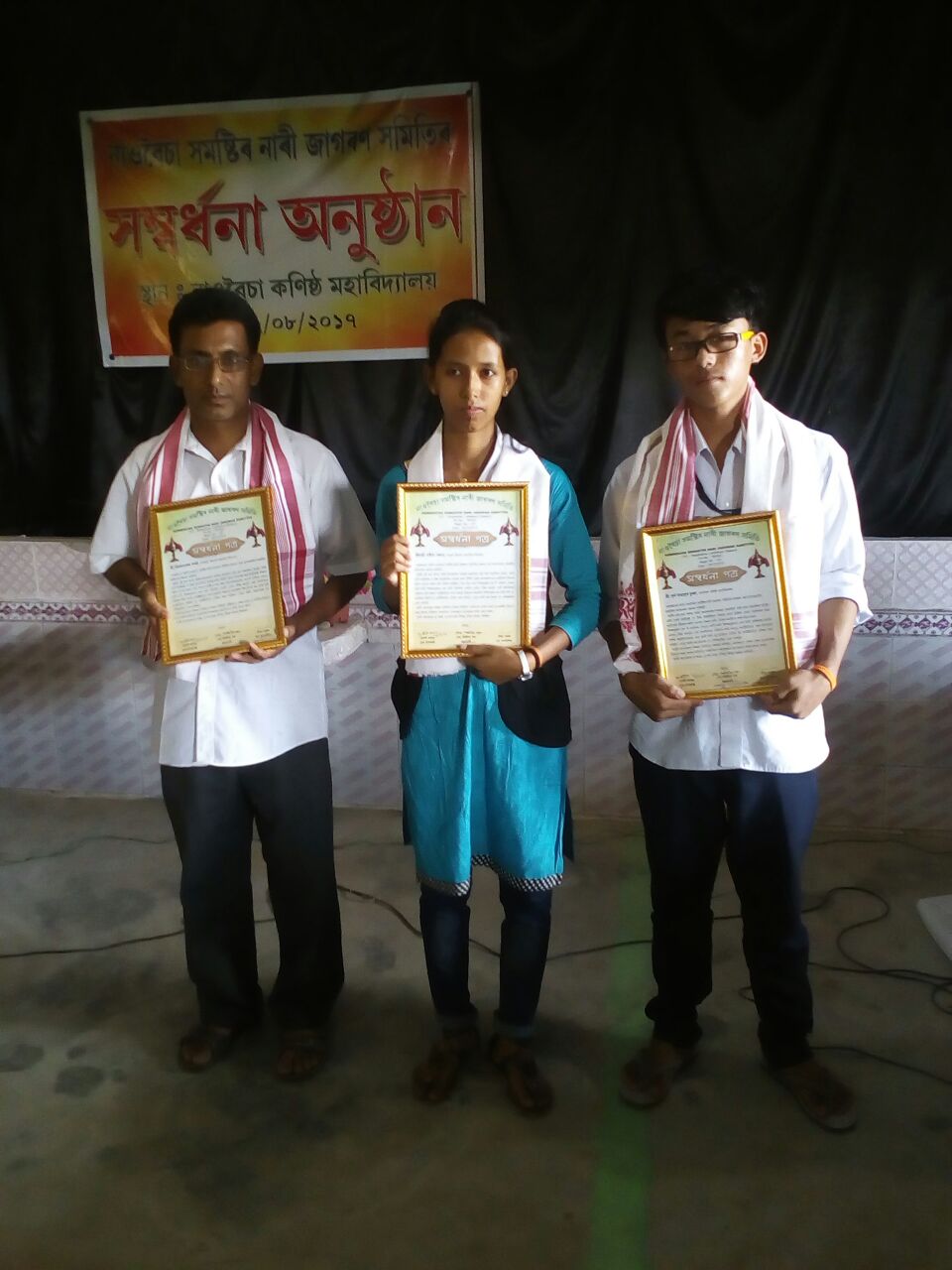 শীৰ্ষ নম্বৰপ্ৰাপ্ত নাওবৈচা কণিষ্ঠ মহাবিদ্যালয়ৰ পূৰ্ণ বাহাদুৰ চুব্বা, লালুক উচ্চতৰ মাধ্যমিক বিদ্যালয়ৰ গৰীমা বৰুৱা, আৰু হাৰমতি উচ্চতৰ মাধ্যমিক বিদ্যালয়ৰ নিলোৎপল শৰ্মাক ফুলাম গামোচ, সম্বৰ্ধনা পত্ৰ, একোটিকৈ কিতাপৰ টোপোলা আৰু নগদ ক্ৰমে ৭০০০, ৫০০০, আৰু ৩০০০ হেজাৰ টকাৰে সম্বৰ্ধনা জনোৱা হয়।