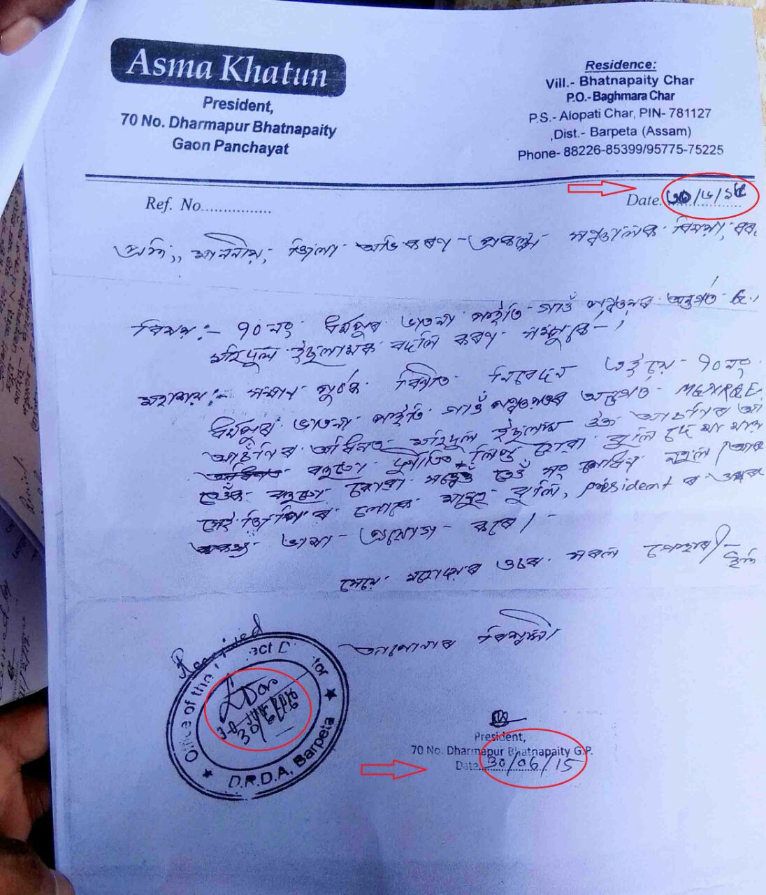 আহত জি এছ আৰ কৰ্মী মহিদুল ইছলামৰ বিৰুদ্ধে আজি ৭০নং ধৰ্মপুৰ-ভাতনাপাইতি গাঁও পঞ্চায়তৰ সভানেত্ৰী তথা কংগ্ৰেছ নেত্ৰী আছমা খাতুনে দুৰ্নীতিৰ অভিযোগ উত্থাপন কৰি মন্দিয়া আৰক্ষী চকীত এজাহাৰ দাখিল কৰে।