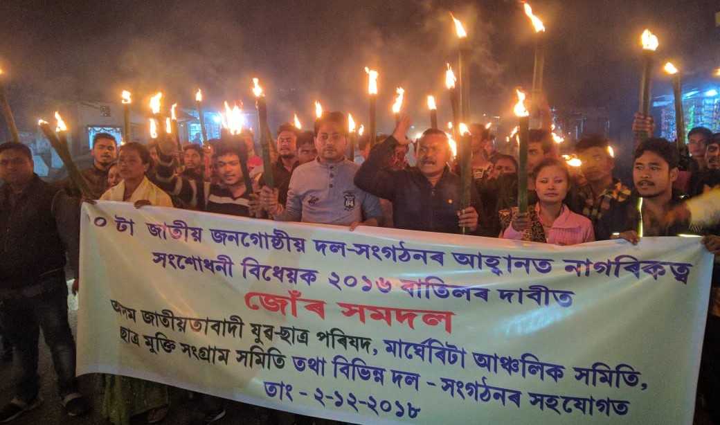 লিডুঃ ‘‘নাগৰিকত্ব সংশোধনী বিধেয়ক ২০১৬’’ ৰ বাতিলৰ বিৰুদ্ধে শেহতীয়াকৈ ৭০টা সংগঠনে একত্ৰিত হৈ লোৱা ‘সংকল্প শিখা যাত্ৰা’ ৰ প্ৰতিবাদ ৰাজ্যৰ ভিন্ন প্ৰান্তৰলৈ সম্প্ৰসাৰিত হোৱা পৰিলক্ষিত হৈছে ৷