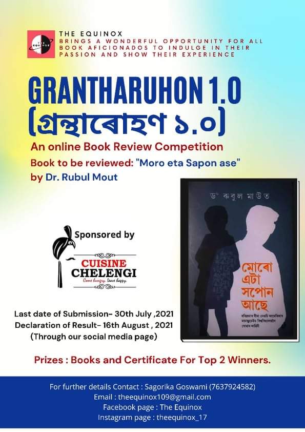 গোলাঘাট, ১৭ জুলাই : ‘ যিমানেই পঢ়িবা, সিমানেই শিকিবা ‘ এই মূলমন্ত্ৰকে সাৰোগত কৰি উঠি অহা প্ৰজন্মৰ মাজত গ্ৰন্থ অধ্যয়নৰ এক আলোড়ন সৃষ্টিৰ লক্ষ্যৰে গোলাঘাটৰ ‘দ্য ইকুইনক্স ‘ নামৰ যুৱ সংগঠনটোৱে অনুষ্ঠিত কৰিবলৈ লৈছে এখনি অনলাইন গ্ৰন্থ সমালোচনা প্ৰতিযোগিতা।