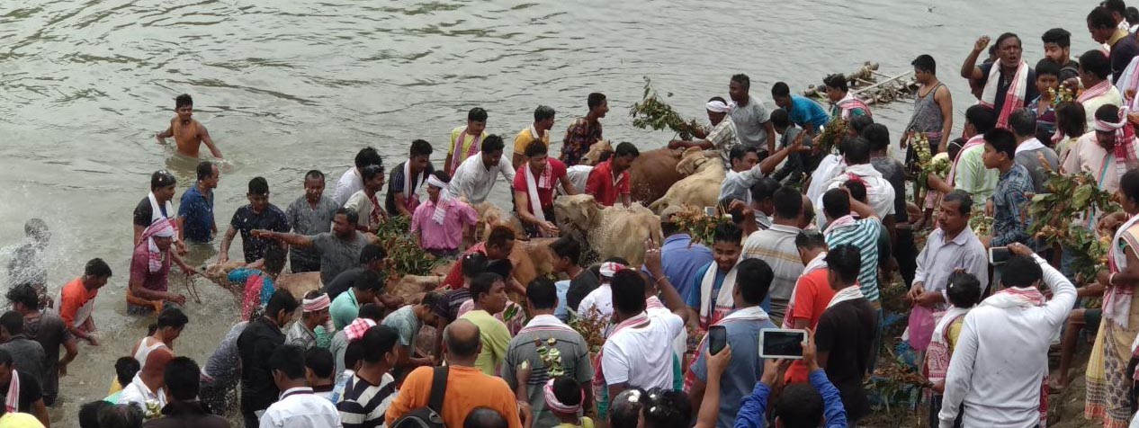 গুৱাহাটীঃ ৰঙালী বিহু অসমীয়াৰ জাতীয় উৎসৱ৷ জাতিটোৰ প্ৰাণৰো প্ৰাণৰ বহাগ বিহুক লৈ এতিয়া ৰাজ্যজুৰি উছাহৰ ঢল বৈছে৷ উজনি-নামনিত ৰাইজে শনিবাৰে পুৱাই ঘৰৰ পৰা ওলাই আহি নৈৰ পাৰত সমবেত হয়৷ ‘‘লাও খা, বেঙেনা খা, বছৰে বছৰে বাঢ়ি যা৷ মাৰ সৰু, বাপেৰ সৰু, তই হ’বি বৰ গৰু৷ দীঘলতি দীঘল পাত, মাখি মাৰো জাত জাত৷’’ নৈৰ পাৰত পৰম্পৰা অনুযায়ী আপ্তবাক্যশাৰী আওৰাই পুৱাই অসমৰ চহৰে-নগৰে, গাঁৱে-ভূঞে পৰম্পৰাগতভাবে গো-সম্পদত সন্মান জনাই অসমীয়াই৷
