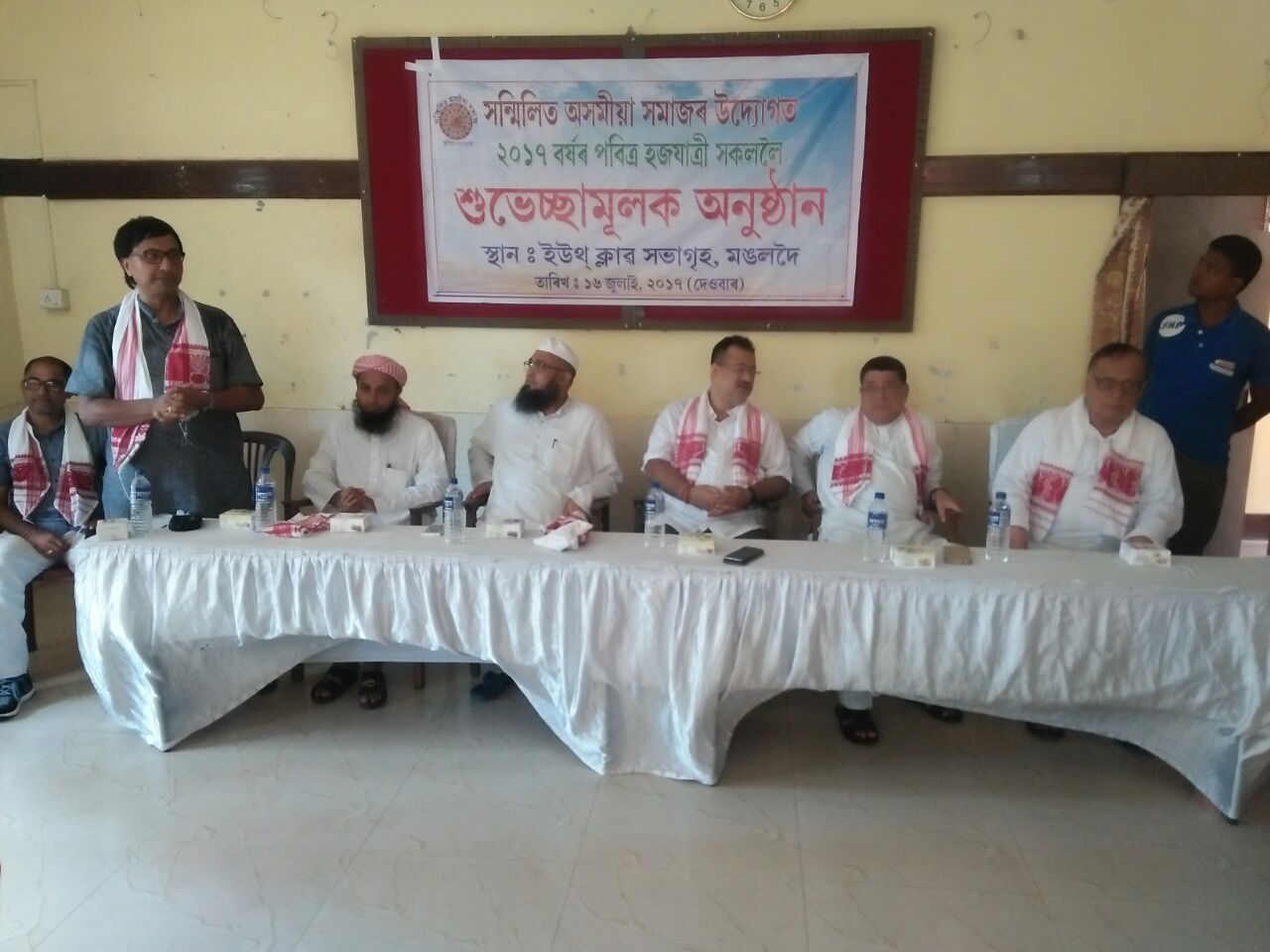 মঙলদৈঃ দৰং জিলাৰ পৰা পবিত্ৰ মক্কাত হজলৈ যাব লগা হজ যাত্ৰী সকলক দেওবাৰে দৰং জিলাৰ বিভিন্ন দল-সংগঠনে সম্ভাষণ তথা শুভেচ্ছা যাঁচে৷ দৰং জিলাৰ মঙলদৈৰ য়ুথ ক্লাৱত অনুষ্ঠিত এখন সভাত ৪৭ গৰাকী হজ যাত্রীক সম্ভাষণ তথা শুভেচ্ছা জ্ঞাপন কৰিবলৈ সভা খনত উপস্থিত থাকে শিক্ষাবিদ নগেন্দ্ৰ নাথ শৰ্মা, প্ৰক্তন মন্ত্ৰী কংগ্ৰেছ নেতা বসন্ত দাস, প্ৰক্তন সাংসদ মাধৱ ৰাজবংশী, বিশিষ্ট উদ্যোগপতি ৰাজীব ডেকা, সাংবাদিক দ্বীপেন কোৱৰকে ধৰি ভালেকেইজন লোক।