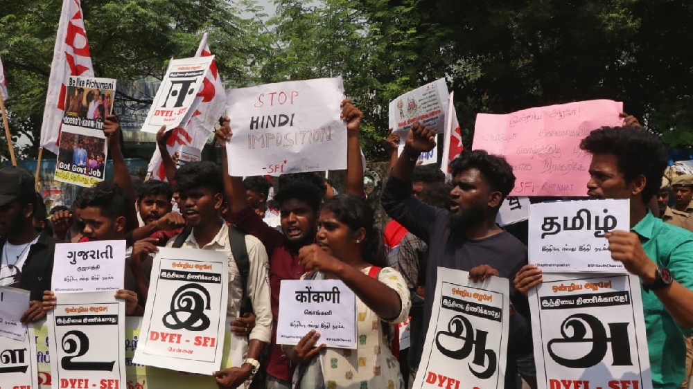 তামিলনাডুৰ মুখ্যমন্ত্ৰী এম কে ষ্টেলিন নেতৃত্বাধীন ডিএমকে চৰকাৰে কয় যে ৰাজ্যখনৰ ইতিমধ্যে দুটা ভাষাৰ নীতি আছে—তামিল আৰু ইংৰাজী। কিন্তু ৰাষ্ট্ৰীয় শিক্ষা নীতিত তিনিটা ভাষাৰ প্ৰস্তাৱ দিয়া হৈছে, য’ত যিকোনো এটা ভাৰতীয় ভাষাৰ পাঠদান তৃতীয় ভাষা হিচাপে থাকিব। অৱশ্যে এই নীতিত হিন্দীয়েই যে তৃতীয় ভাষা হ’ব সেয়া স্পষ্টকৈ উল্লেখ নাই যদিও তামিলনাডু চৰকাৰৰ মতে, এই শিক্ষা নীতিৰ জৰিয়তে হিন্দী বলয়ৰ ৰাজনীতি পুষ্ট ভাৰতীয় জনতা পাৰ্টি নেতৃত্বাধীন কেন্দ্ৰীয় চৰকাৰে দক্ষিণ ভাৰতত হিন্দী ভাষা জাপি দিব বিচাৰিছে।