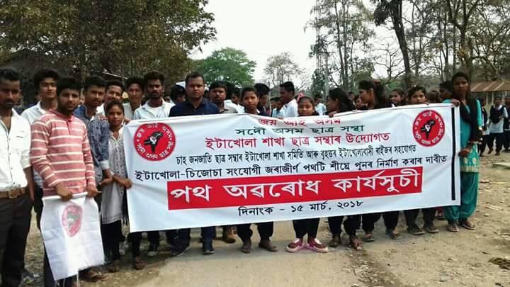 ইটাখোলাঃ বৃহস্পতিবাৰে পথ মেৰামতিৰ দাবীত শোণিপুৰৰ ইটাখোলাত আছুই উত্তাল প্ৰতিবাদ সাব্যস্ত কৰে। ইটাখোলা শাখা ছাত্ৰ সন্থা আৰু চাহ জনজাতি ছাত্ৰ সন্থাৰ ইটাখোলা শাখা সমিতিয়ে ইটাখোাল-চিজোচা পথ অৱৰোধ কৰি পথটো মেৰামতি কৰাৰ দাবী জনায়।
