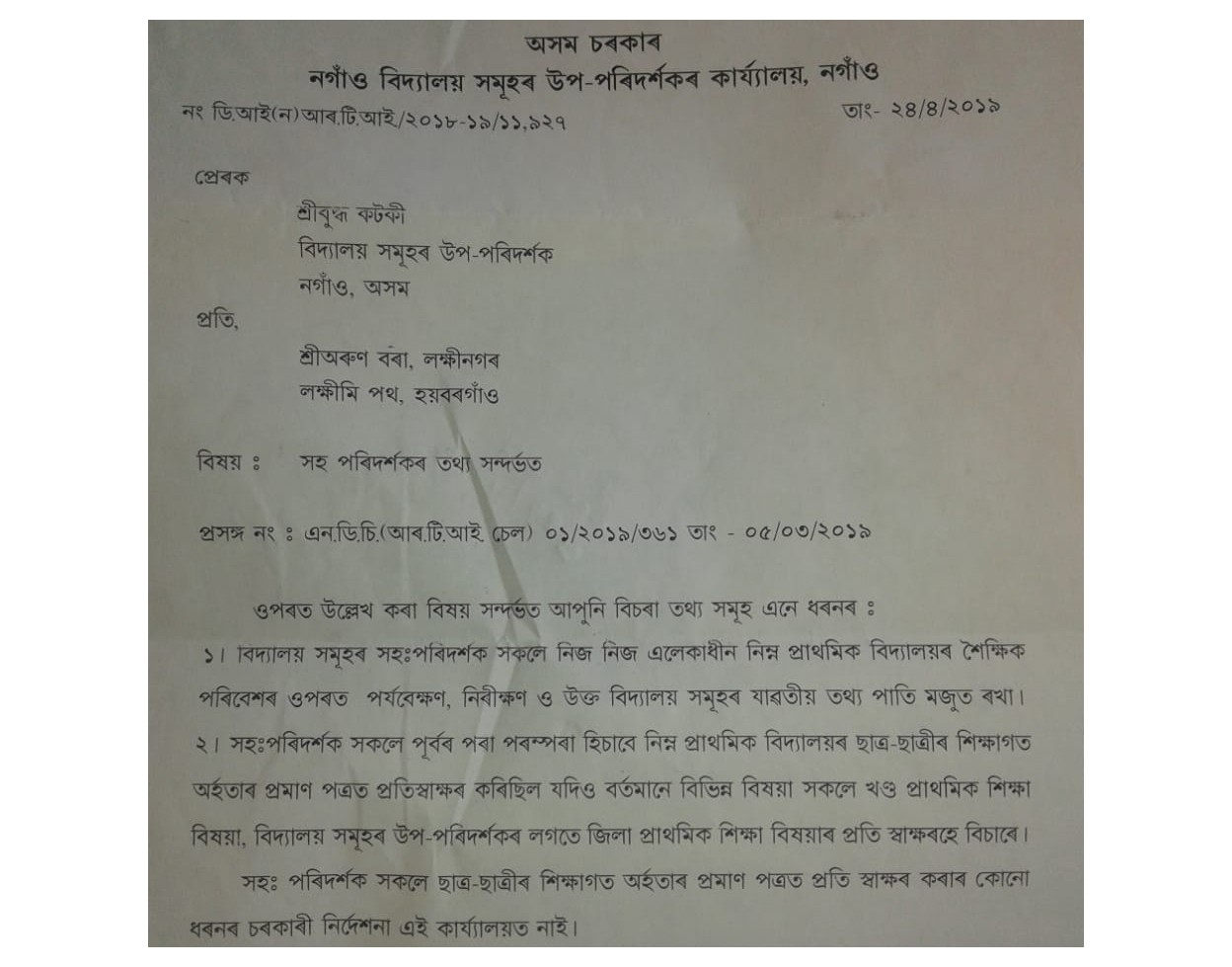 শেহতীয়াকৈ নগাঁও জিলা বিদ্যালয়সমূহৰ উপ-পৰিদৰ্শকৰপৰা পোৱা এক আৰটিআই উত্তৰে সচেতন ৰাইজৰ চকু কপালত তুলিছে। কাৰ্যালয়টোৰপৰা পোৱা চিঠি নং ডিআই(ন) আৰটিআই/২০১৮-১৯/১১,৯২৭ তাং ২৪/৪/২০১০ত কোৱা হৈছে যে পূৰ্ব পৰম্পৰাগতভাৱে নিম্ন প্ৰাথমিক বিদ্যালয়ৰ শিক্ষাগত অৰ্হতাৰ প্ৰমাণ-পত্রত প্ৰতি স্বাক্ষৰ কৰা হয়।