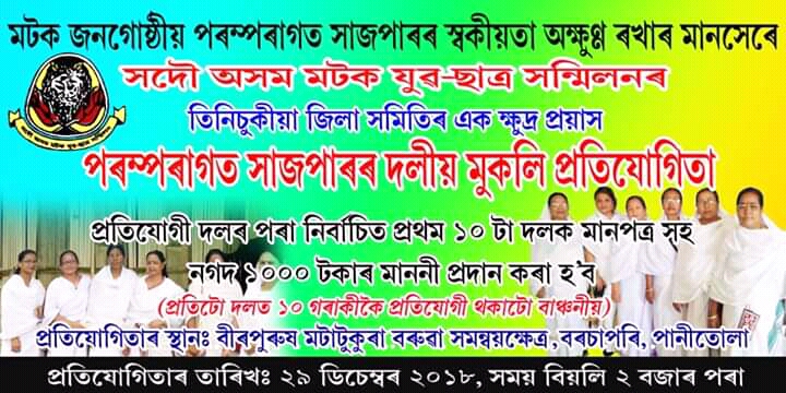 অধিৱেশনখনত এইবাৰ এক ব্যতিক্ৰমী প্ৰতিযোগিতা আয়োজন কৰাৰ সিদ্ধান্ত গ্ৰহণ কৰা হৈছে। মটক জনগোষ্ঠীৰ পৰম্পৰাগত সাজ-পাৰৰ স্বকীয়তা অক্ষুন্ন ৰখাৰ মানসেৰে ২৯ ডিচেম্বৰ, ২০১৮ তাৰিখে পৰম্পৰাগত সাজ-পাৰৰ দলীয় মুকলি প্ৰতিযোগিতা আয়োজন কৰা হৈছে আৰু প্ৰতিযোগী দলৰপৰা নির্বাচিত প্ৰথম দহটা দলক মান-পত্ৰসহ নগদ ১০০০ টকাকৈ মাননী প্ৰদান কৰা হ’ব বুলি তিনিচুকীয়া জিলা মটক যুৱ-ছাত্ৰ সন্মিলনৰ সম্পাদক কমলদ্বীপ বৰুৱাই জানিবলৈ দিছে।