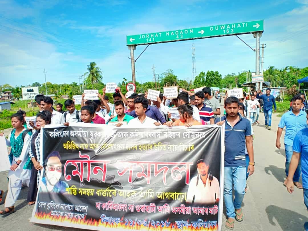৩৭ন ৰাষ্ট্ৰীয় ঘাইপথৰ কুঁৱৰীটোলৰ পৰা মহকুমাধিপতি কাৰ্যালয়লৈ মৌন সমদল উলিয়াই নৃশংস হত্যাকাণ্ডৰ সৈতে জড়িত লোকসকলৰ গোচৰৰ বিচাৰ ফাষ্ট ট্ৰেক আদালতত কৰি শাস্তি প্ৰদান কৰাৰ লগতে শিল্পী দুজনক শ্বহীদ ঘোষণা কৰাৰ দাবী জনায় ছাত্ৰ-ছাত্ৰীসকলে৷