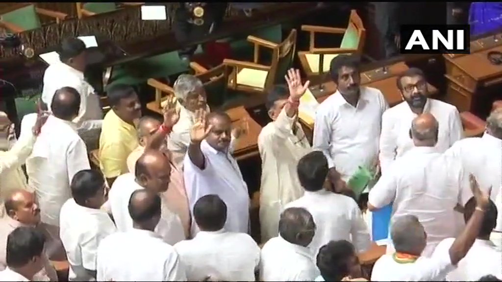 Bengaluru: Congress' DK Shivkumar, JD(S)'s HD Kumaraswamy & other MLAs at Vidhana Soudha after resignation of BJP's BS Yeddyurappa as Chief Minister of Karnataka. pic.twitter.com/qdGu8zGXWK