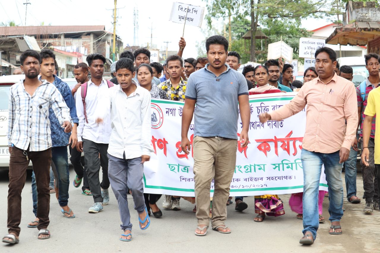 কেইবা শতাধিক ছাত্ৰ মুক্তি সংগ্ৰাম সমিতিৰ নেতা-কৰ্মীয়ে চুক্তি বাতিল কৰাৰ দাবীত ৰাজ্য চৰকাৰৰ বিৰুদ্ধে ক্ষোভ ব্যক্ত কৰে৷ শিৱসাগৰ জিলা সমিতিৰ সভাপতি ৰিতুমণি হাজৰিকা আৰু সাধাৰণ সম্পাদক ৰাজু চেতিয়া ফুকন আৰু মানস দত্তৰ নেতৃত্বত শিমলুগুৰিৰ পৰা নাজিৰা লৈকে সমদল কৰি মহকুমাধিপতি কাৰ্যালয়ত উপস্থিত হয়।