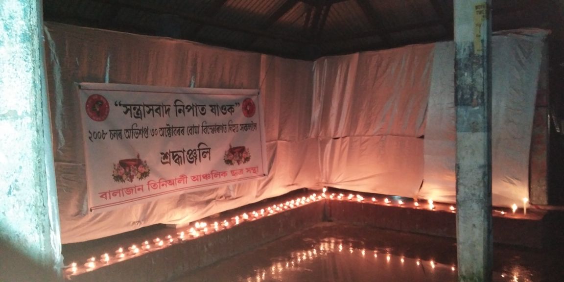সন্ধিয়া ৫.৩০ বজাত বালাজান তিনিআলি আঞ্চলিক ছাত্ৰ সন্থাই যোৱা ২০০৮ চনৰ ৩০ অক্টোবৰৰ দিনটোত ধাৰাবাহিক বোমা বিস্ফোৰণত নিহত সকলৰ প্ৰতি গভীৰ শ্ৰদ্ধাঞ্জলি জনাই বালাজান তিনিআলি বজাৰৰ জিৰণি চৰাত ছাত্ৰ সন্থাৰ শতাধিক কৰ্মীয়ে বন্তি প্ৰজ্বলন কৰে৷
