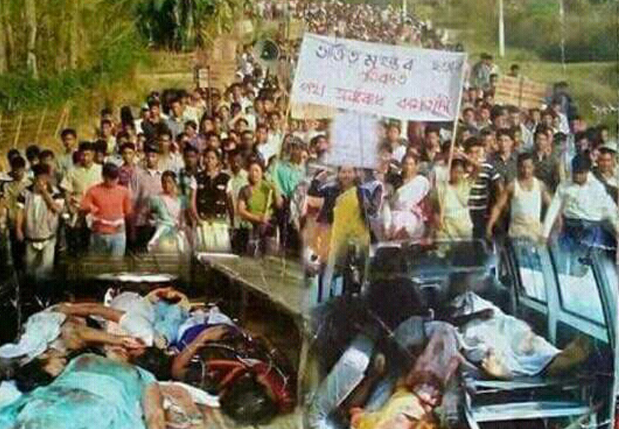 তিনিচুকীয়াঃ  ২০০৬ চনৰ ভয়াবহ দিনটোক কেনেকৈ পাহৰিব তিনিচুকীয়াবাসীয়ে৷ ৰাজ পথত থলুৱাৰ তেজ বৈ থকাৰ দৃশ্য আজিও চকুৰ সন্মুখত ভাহি থাকে জিলাখনৰ লোকৰ৷ ৰাষ্ট্ৰ সন্ত্ৰাসৰ বিৰুদ্ধে প্ৰতিবাদ কৰিবলৈ ওলাই আহি বুকুত গুলী পাতি লৈ ৰাজ পথত ঢলি পৰিছিল ৯গৰাকীকৈ থলুৱাই৷ এগৰাকী লোকক নিৰাপত্তাৰক্ষীয়ে হত্যা কৰাৰ পিছত ন্যায়ৰ দাবীত প্ৰতিবাদ কৰিবলৈ ওলাই অহা লোকসকলক লক্ষ্য কৰি গুলীচালনা কৰাত তেজৰ নৈ বৈ গৈছিল আজিৰ দিনটোতে৷
