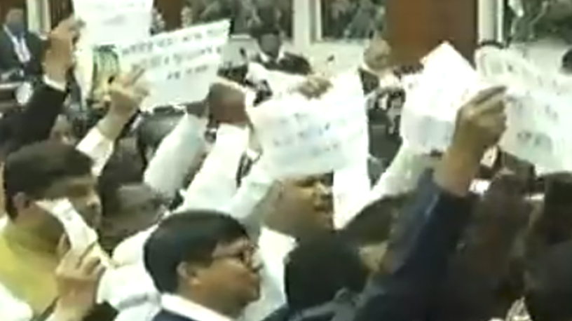 বিৰোধি কংগ্ৰেছৰ বিধায়সকলে ৰাজ্যপালে ভাষণ আৰম্ভ কৰাৰ পিছতে ৰাজ্যপালে ভাষণ দি থকা ঠাইলৈ গৈ প্লেকাৰ্ড প্ৰদৰ্শন কৰে৷ আইন শৃংখলা বৰ্ত্তাই ৰখাত ৰাজ্য চৰকাৰ বিফল হোৱাৰ অভিযোগ উত্থাপন কৰি বিৰোধিয়ে হুলস্থূলীয়া পৰিৱেশৰ সৃষ্টি কৰে৷