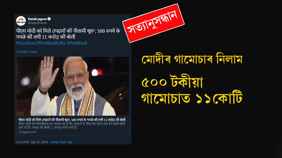 প্ৰধানমন্ত্ৰী নৰেন্দ্ৰ মোদী ‘অৱতাৰী পুৰুষ’৷ পিছে এই আখ্যা আমি দিয়া নাই, দিছে আমাৰ সমাজৰে একাংশই৷ কিন্তু কিয় দিছে এই আখ্যা? সদ্যহতে ছচিয়েল মিডিয়াত এই খবৰ বিয়পি পৰিছে৷ মোদীৰ উপহাৰ নিলামৰ বাতৰিৰ সন্দৰ্ভত এক দাবী উত্থাপন হৈছে যে মোদীয়ে উপহাৰ পোৱা ৫০০ টকাৰ গামোচাখন ১১ কোটি টকাত নিলাম হৈছে আৰু এই নিলামৰ পৰা পোৱা এই টকা মোদীয়ে দান কৰিছে প্ৰধানমন্ত্ৰী ৰক্ষা কোষলৈ৷